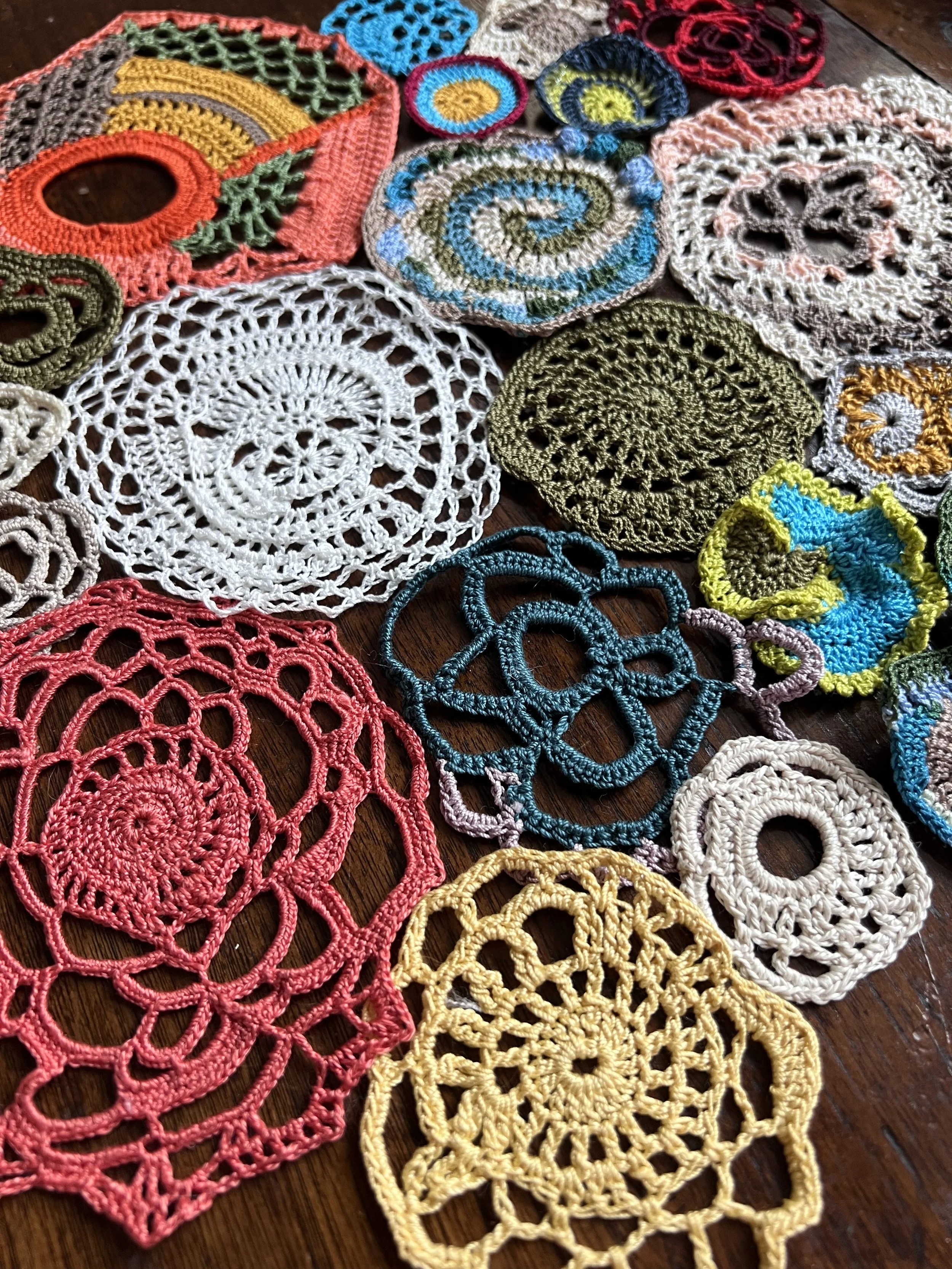 Creating small, organic shaped motifs in crochet is my favorite things to do. I literally doodle with a hook and thread. Once I have worked through all the different aspects of the designs I just let my hands and heart take over.
