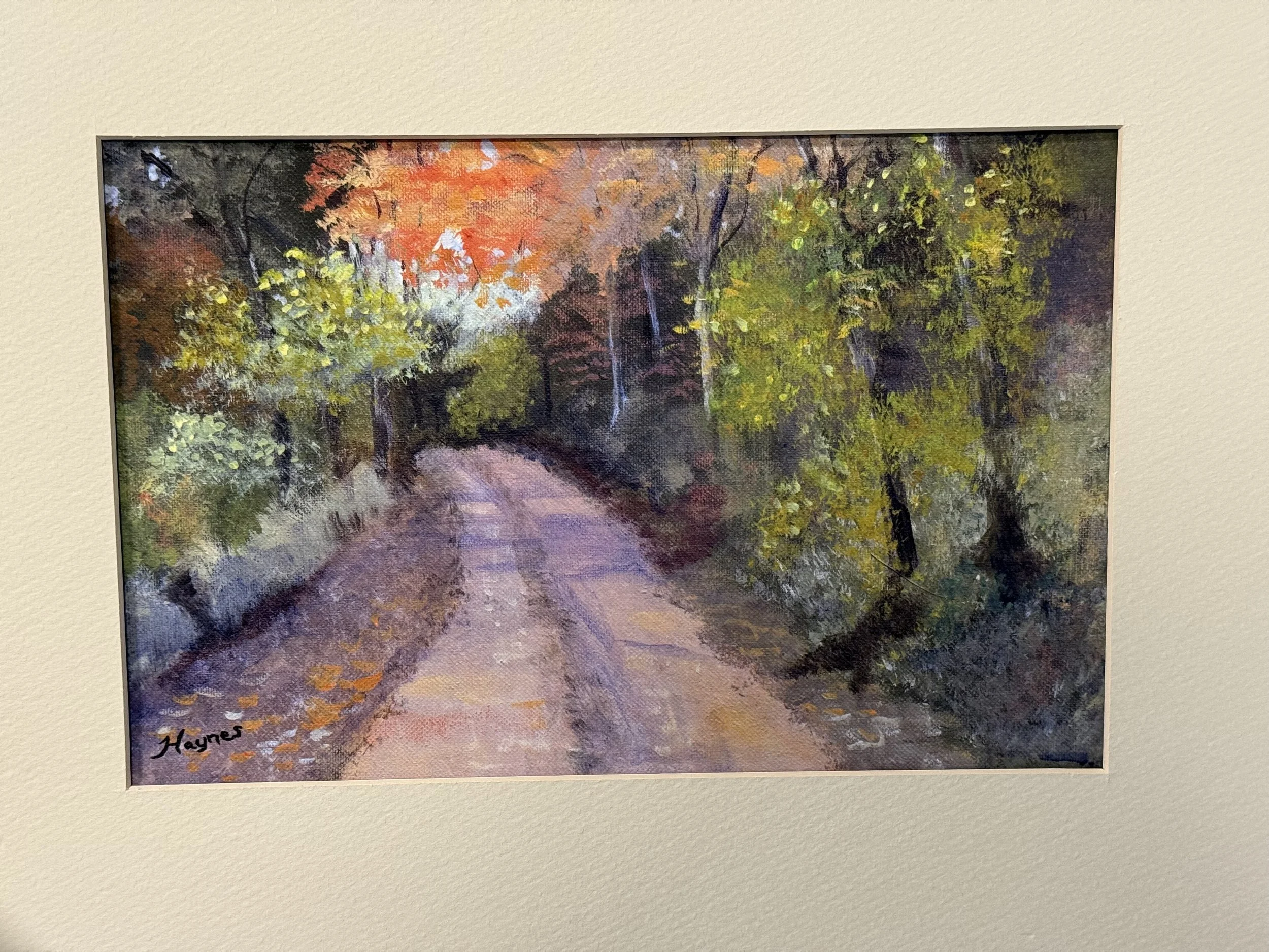 Sheryl Means 9/10/25 Sheryl Means 9/10/25 Beyond The Surface Print of a painting depicting a back road in Arkansas in the fall. Green and orange trees. Read More